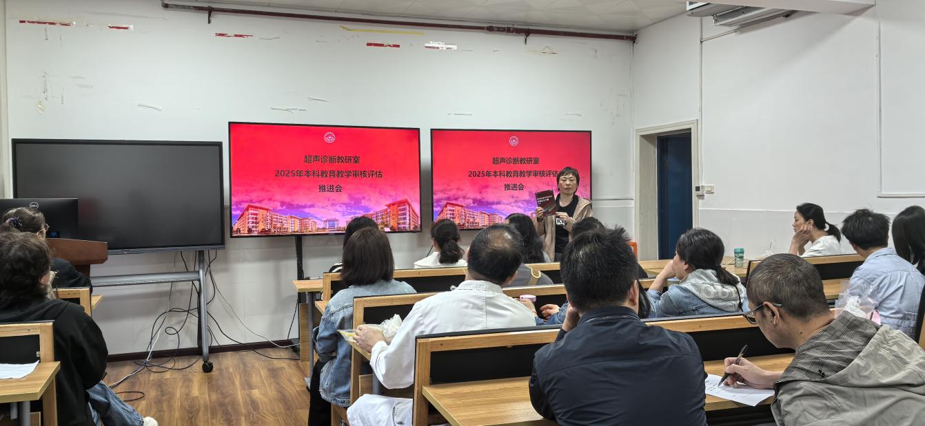 超声诊断学教研室于2025年4月16日召开本科教学评估推进会,超声诊断学教研室主任张蓓、副主任文静、于绍梅、教学秘书张立欣及超声诊断学教研室任课老师参加。