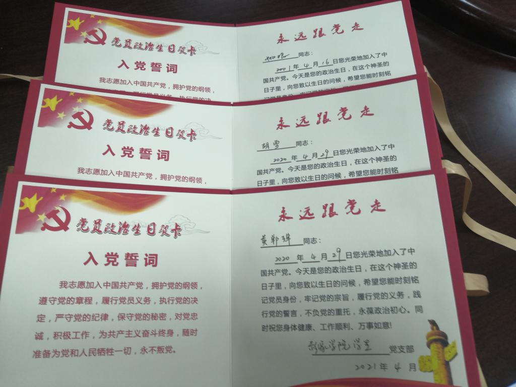 全体党员为政治生日在四月份的姚琨、黄郸殚、胡雪三位同志过政治生日。尚国燕、魏渝清两名老党员并向他们赠送政治生日贺卡。同时希望青年党员要珍惜现在的幸福生活,脚踏实地的为祖国的建设作贡献,做一个对人民、对社会、对国家有用的人。员工党员胡雪激动的说:“今年是建党100周年,今天是我一岁的政治生日,真的太有意义了!”