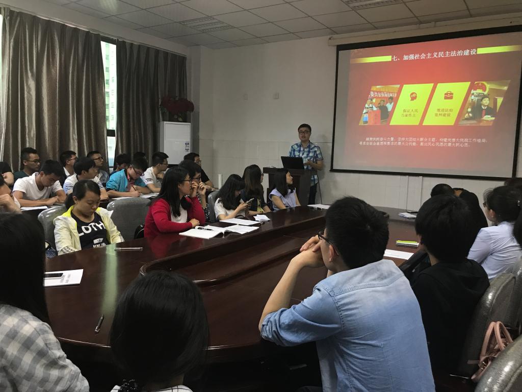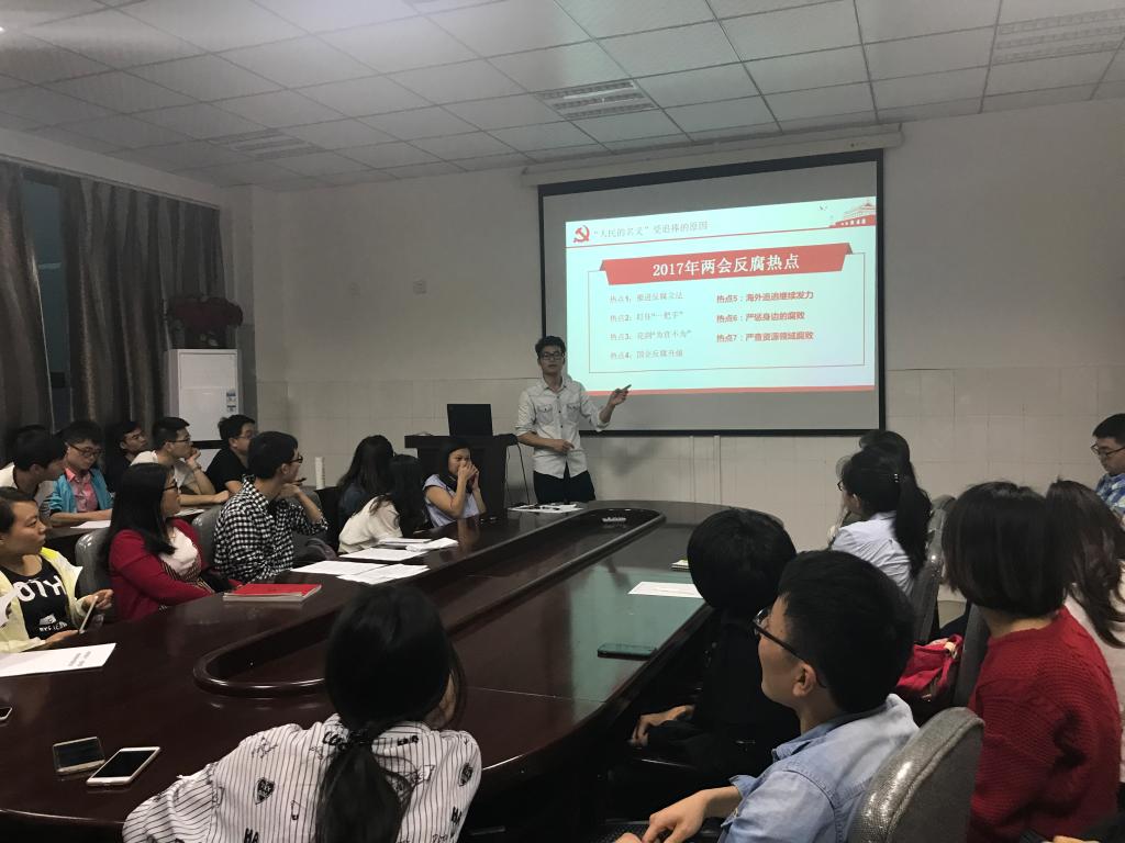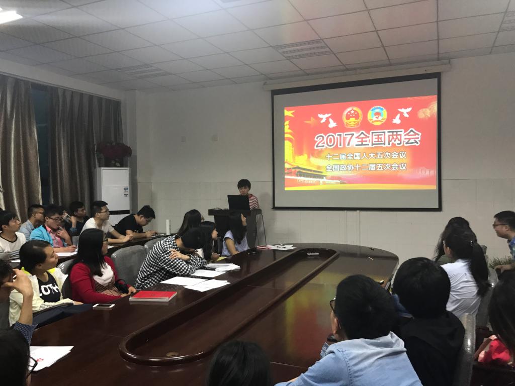 来自2012级的郭威、李梦婕、方霞三位同学就反腐廉政、2017年两会八大热词、十大关注热点等话题为同学们详解“人民的名义”剧集受追捧的原因和当代老员工如何拒腐,阐释2017年国家工作总体部署和总体任务。来自2012级的匡帅、毛善永、何伟欣三位同学向同学们介绍了贵州省第十二届党代会的主题、贵州过去五年的发展成就和今后五年的奋斗目标。