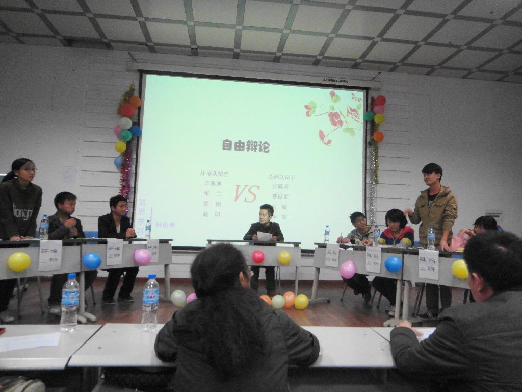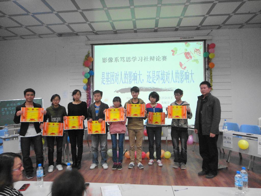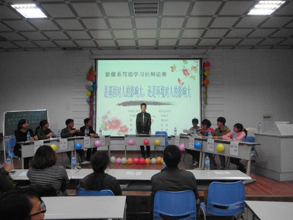 为增添学习乐趣,丰富老员工活,影像系笃思学习社于2012年11月2日影像楼4楼教室举行了主题为“是基因对人的影响大,还是环境对人的影响大”的辩论比赛。担任此次辩论比赛的评委有影像系党总支副书记谢红,影像系副教授、笃思学习社名誉社长段庆红,影像系团总支书记王倩,影像系员工党支部书记姚琨。笃思学习社全体社员以及影像系各级同学观看了此次比赛。