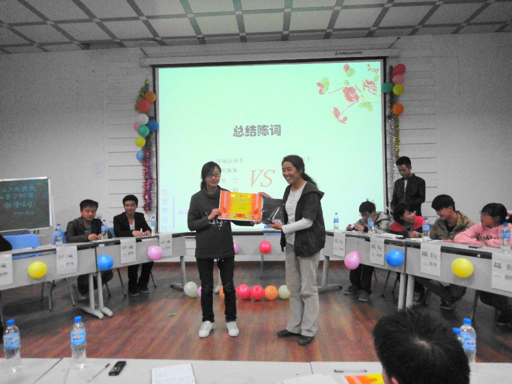 比赛结束后,由各位评委老师评选出了本次辩论赛的优胜方以及一名最佳辩手和其余优秀辩手,并请谢书记与段庆红教授对本次活动做了最后点评和总结,并为获奖选手颁发奖状和奖品。获得本次比赛最佳辩手的是2011级学习社成员张兰同学,何璇、曹禄军、张毓芬、李顺、陈佩佩、雷鹏、戴阳各获优秀奖。