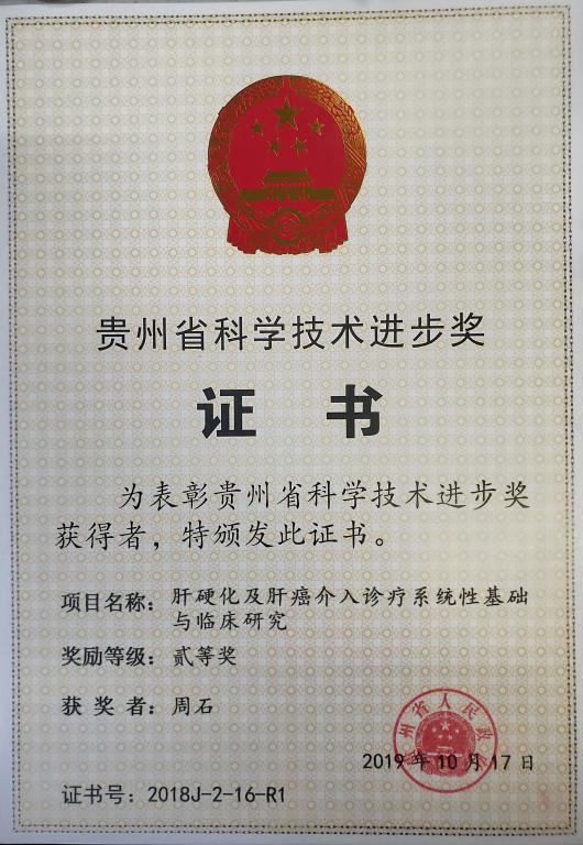 10月24日,贵州省科学技术奖励大会在贵州省人民会堂举行,公司周石教授团队项目“肝硬化及肝癌介入诊疗系统性基础与临床研究”荣获2018年度贵州省科技进步奖二等奖。
