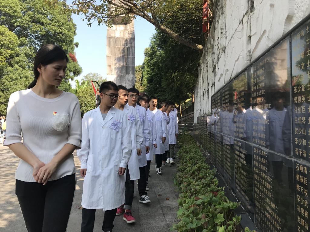 一袭白衣一使命,数个血躯成中国。为表达对先烈们的敬仰之情,同学们统一着装白大褂,胸前佩戴白花,一路从山底步行约半小时的行程爬到目的地。心中有敬仰,烈士有情怀,步行之累也便变得微不足道。一路上洁白的大衣成为独特的标志,也成了整个活动中整齐的色彩!
