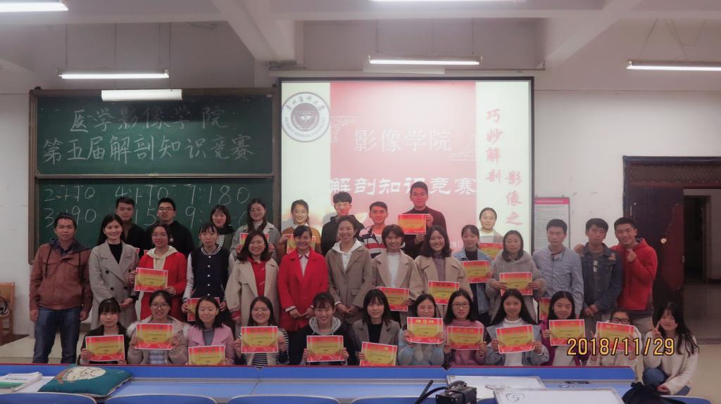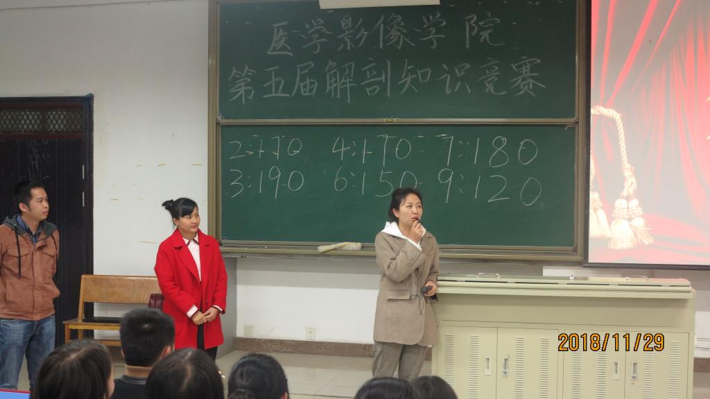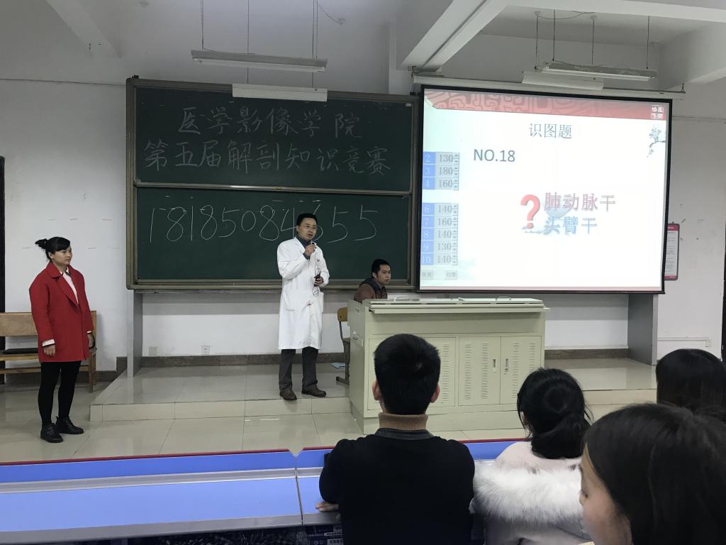 为加强员工对专业基础课程的学习,丰富员工课余生活,学院于11月29日在北校区2201教室举办了第五届解剖知识大赛,附院影像科老师吴桂鹏担任评委,附院影像科老师胡娜担任主持。公司党委副书记姚琨、教学科研管理科科长余晖、员工科科长李丹、分团委书记姚婵、辅导员陈丽参加此次活动。