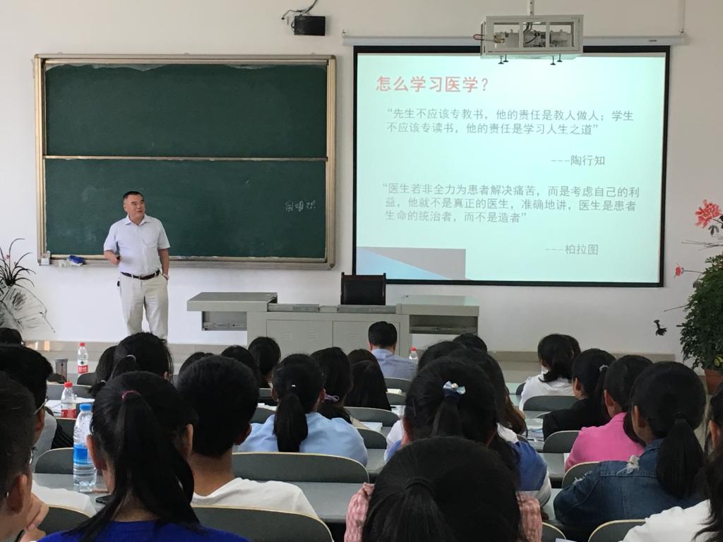 周石经理以“乐在其中的医者之道”为开篇,向同学们介绍了学院及医学影像学科的现状和发展规划;接着,就员工的学医初衷和目的从医学的本质、如何学习医学、从医者应具备的素质修养以及合格医务者的素质等方面为同学们作了详细的讲解,并对同学们表达了寄语,希望他们能做一名幸福的医者:因兴趣而工作,因工作学习而产生兴趣。