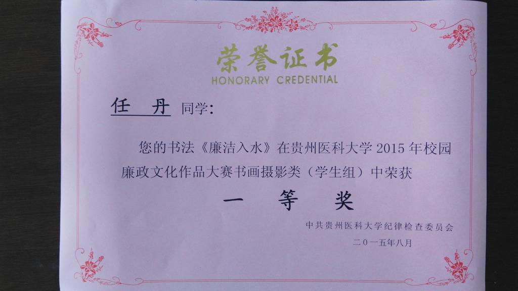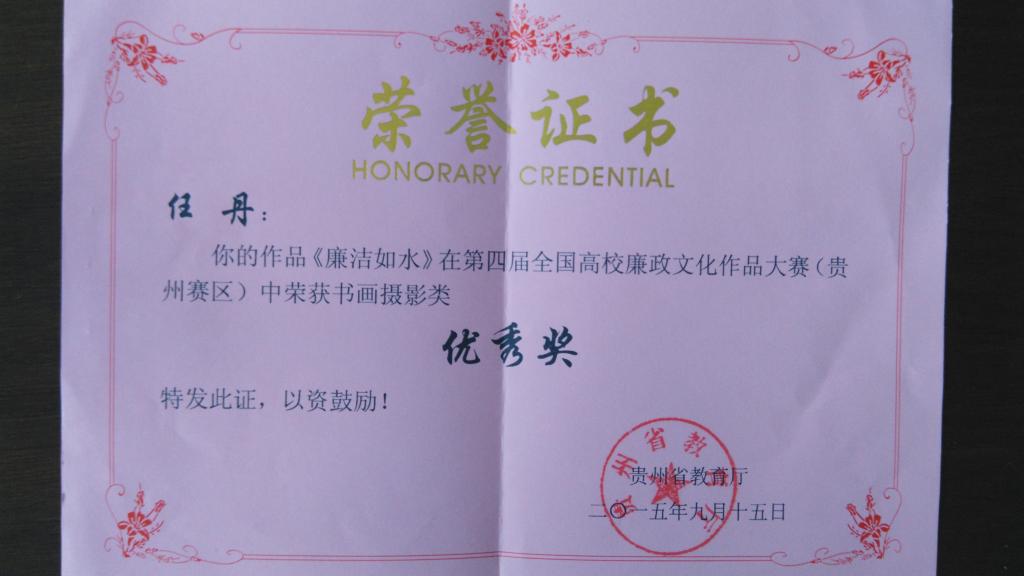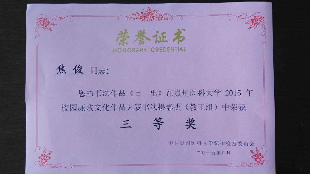 公司教师焦俊的书法作品《日出》在必一运动2015年校园廉政文化作品大赛书法摄影类(教工组)中荣获三等奖;2014级员工任丹的书法《廉洁如水》荣获(员工组)一等奖,并在第四届全国高校廉政文化作品大赛(贵州赛区)中荣获书画摄影类优秀奖。