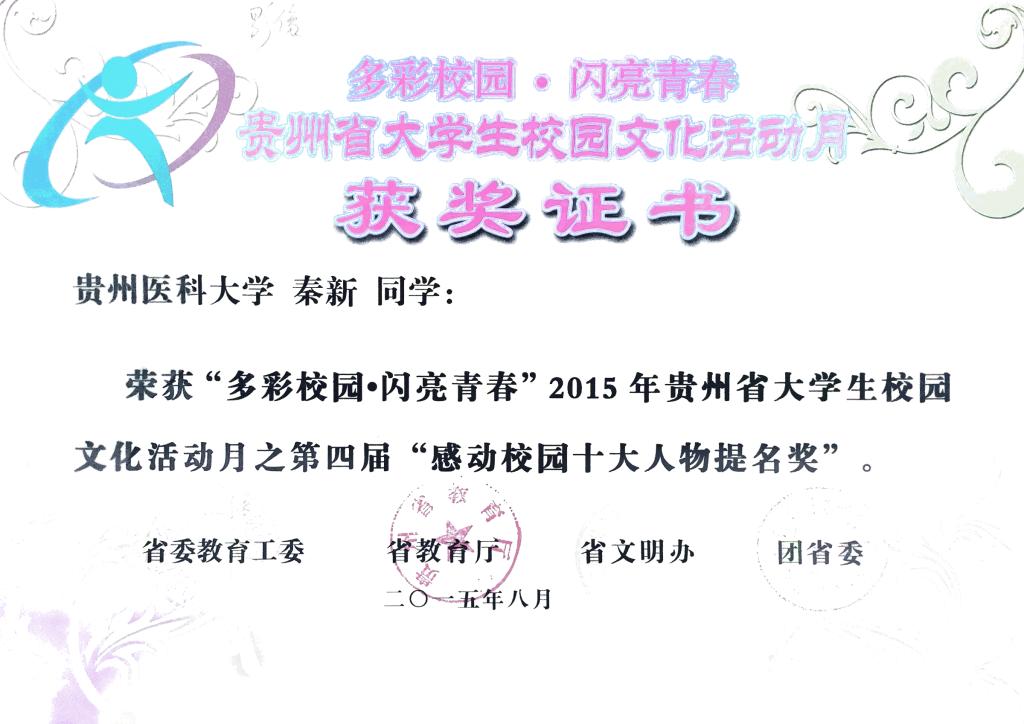 公司秦新同学荣获2015年贵州省老员工校园文化活动月之第四届“感动校园十大人物提名奖”。