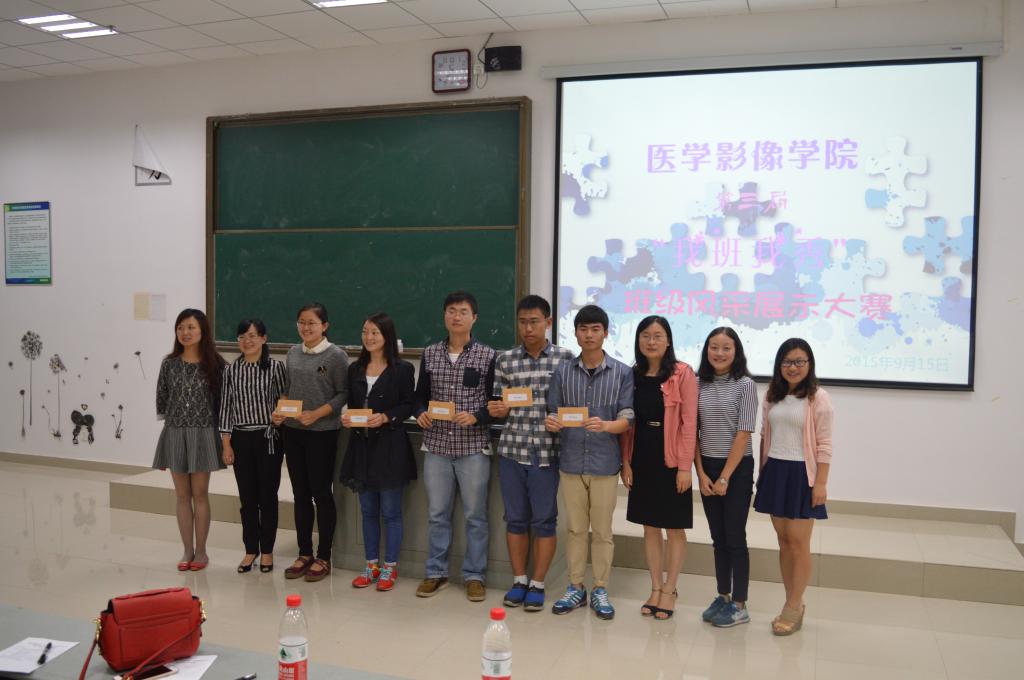 比赛中,来自12级医学影像技术谢小春、12级医学影像学何伟欣、13级医学影像技术李小平、13级医学影像学罗海心和14级医学影像学陈宇欣分别以“青春·梦想”、“成长,我们的故事”、“献给践行社会主义核心价值观的学子们”、“凝结一束,携手同行,‘我’的简历”和“逸香茶屋”为主题进行PPT展示演讲,为大家展示了他们所在班级团结合作、奋力向上的精神面貌。经过激烈的角逐,14级医学影像班获得优胜奖,其余班级获得优秀奖,公司党委书记李雪梅给各班级颁发了奖品。