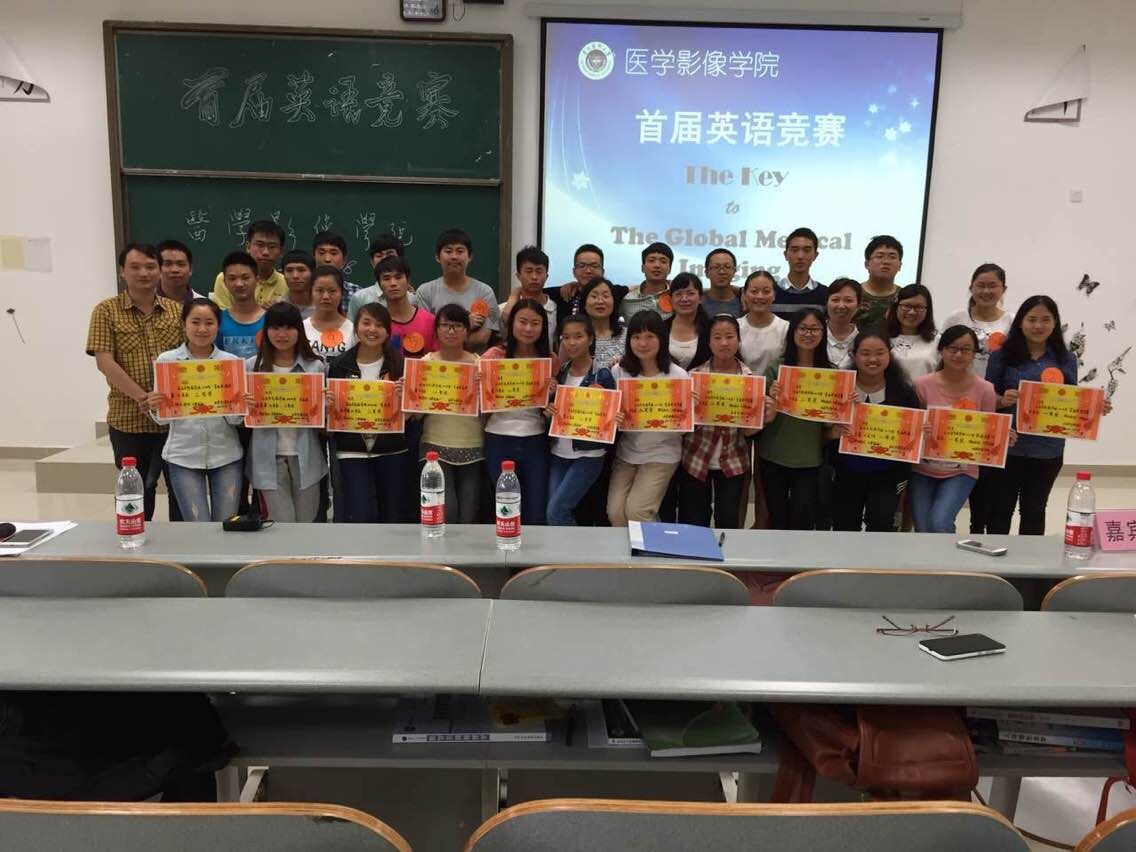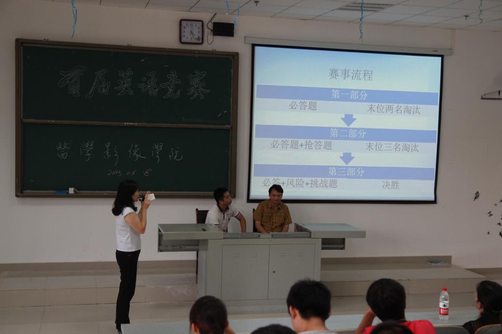 此次比赛的主题为“The Key to The Global Medical Imaging”,涵盖听力、长/短对话、单词&语法、视频、俚语&谚语,分必答题、抢答题、风险题、挑战题、观众互动五个板块。公司2014、2013级员工共有27人参赛,3人为一组。选手们在答题过程中纷纷发挥聪明才智和团结协作的精神,整个竞赛过程气氛紧张、激烈,经过近两个小时的竞争,来自2013级医学影像学(医学影像技术)专业的罗海心、韦阳、朱丙同学凭借深厚的英语知识积累和默契的配合,勇夺桂冠。