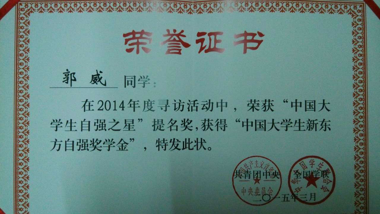 在大学里的点点滴滴只是人生中的一部分,在今后的旅途中郭威将继续以“奋斗不止,自强不息”为生命信条,以自身的努力为自己活出精彩与无悔。
