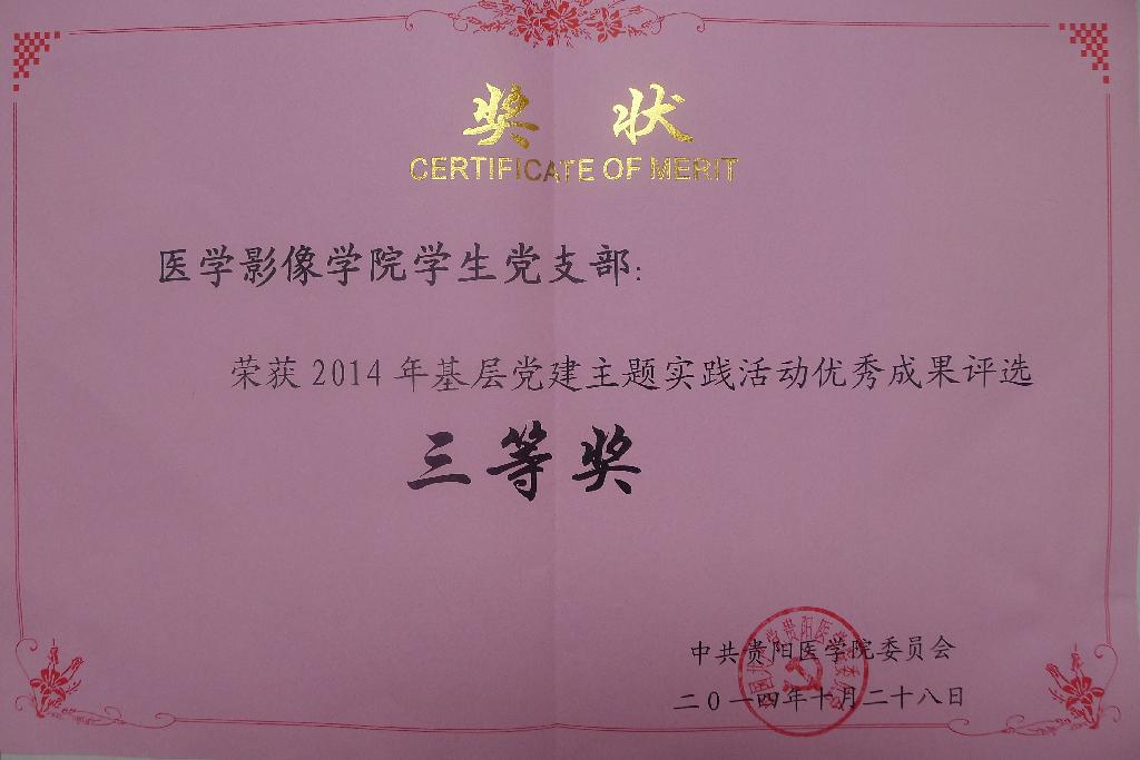 必一运动官网员工党支部荣获2014年贵阳医学院基层党建主题实践活动优秀成果评选三等奖。