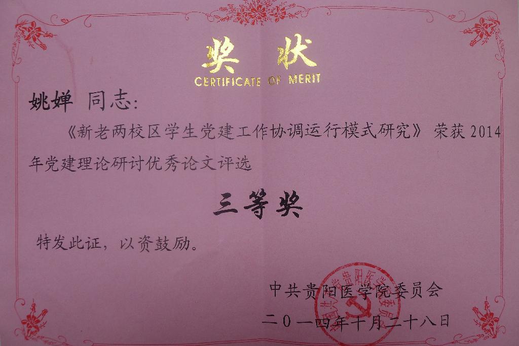 辅导员姚婵的《新老两校区员工党建工作协调运行模式研究》在贵阳医学院举办的2014年党建理论研讨优秀论文评选中荣获三等奖。