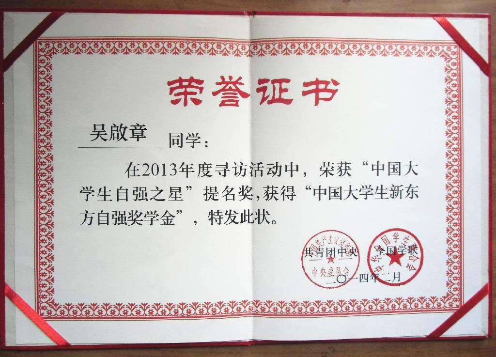 成功需要一种积极的心态。他在刚刚进入大学就向党支部递交了入党申请,他始终坚持认真学习国家政策,掌握时事动态;积极参加校院组织的各项活动,在思想上、政治上、行动上积极向党组织靠拢,思想品德端正、崇尚科学、自觉遵守各种法律法规,遵守学校、学院的各项 规章制度,处处为同学着想,具有强烈的社会责任感和事业心。他通过参加党校培训、认真地学习了各种政治理论知识,在思想上有了质的飞跃,终于经过党组织一年的严格考验,2013年7月他成为了一名光荣的共产党员。 刚进入大学,他就凭借自信和坚强的信念带病参加了长达半个月的军训,在军训期间所表现出来的坚持不懈的精神得到了老师和同学的赞扬与肯定,并获得了学校颁发“军训标兵”荣誉证书。同时,他经过努力,获得了“省级志愿之星”、“三等院级奖学金”、“第九届全国少数民族传统体育运动会先进个人”等荣誉称号。