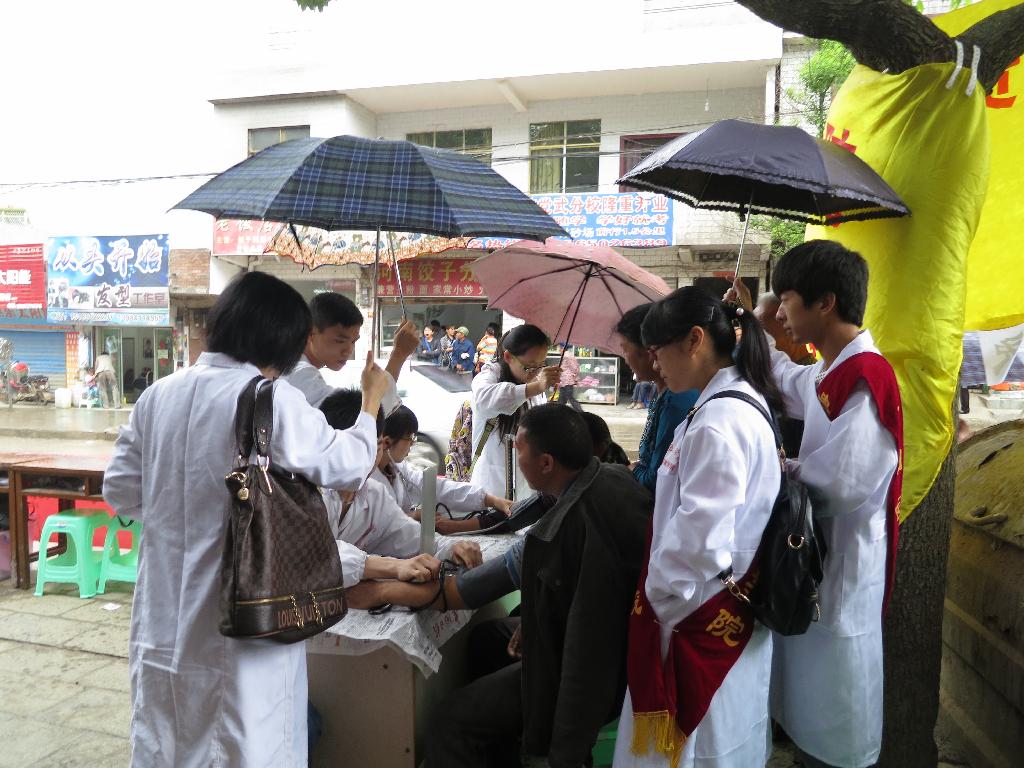 此次活动包括为乡民测量血压、提供医疗咨询、发放常用药品以及宣传高血压、肺结核、手足口病的防治和核辐射的应对等。活动刚开始,天空就下起了小雨,但丝毫没有影响公司师生的义诊热情,打起雨伞坚持为群众提供医疗服务。活动中,师生分工协作,各司其职,认真解答群众关于一些生活中的常见病、多发病的预防诊治及健康保健问题。共义务为150余名乡民进行了健康咨询,200余名乡民测量血压,发放药品300余元,发放各种疾病防治宣传手册500本。