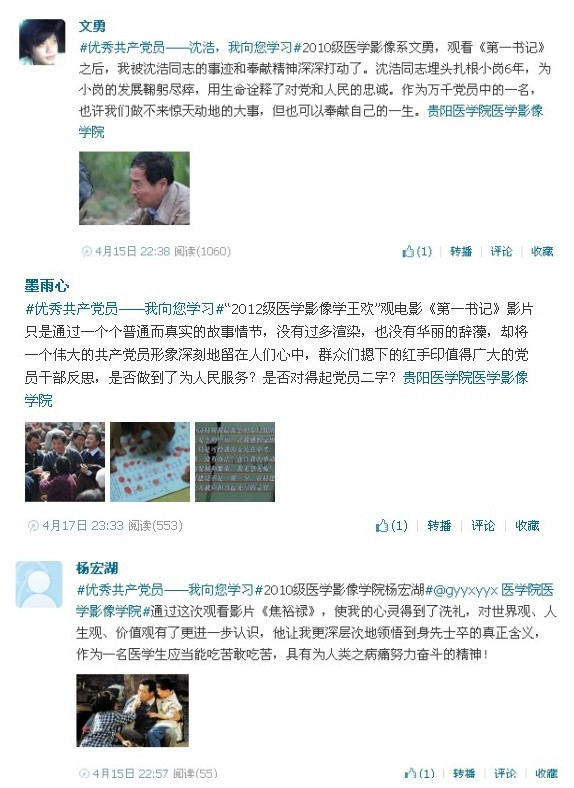 公司组织集中或者网上观看《焦裕禄》等8部电影,丰富群众路线教育实践活动内容。同时创新教育实践活动新形式,在活动周期间举办影评和讨论活动,通过手机或电脑登陆腾讯微博,添加“#优秀共产党员---我向您学习#”并“@贵阳医学院必一运动官网”,发布140字以内的电影评论或感言,最后评出了“十佳”微评奖给予奖励。