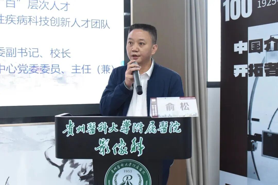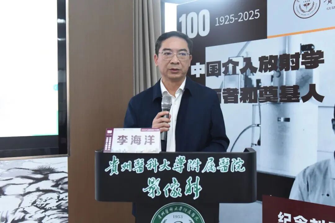 李海洋致辞,他表示,刘子江教授作为贵医附院医学影像科的首任主任,他带领全科人员不懈求索,开拓进取,20世纪70年代在全国率先开展了介入治疗,之后受卫生部委托,举办了多期全国培训班,为我国介入放射学“从无到有、从弱到强”, 起到了开创和奠基的作用。值此刘子江教授诞辰100周年之际,我们要传承他敢闯敢试的创新勇气、精益求精的奉献初心、胸怀家国的医者担当,在医院高质量发展新征程上续写新的辉煌。