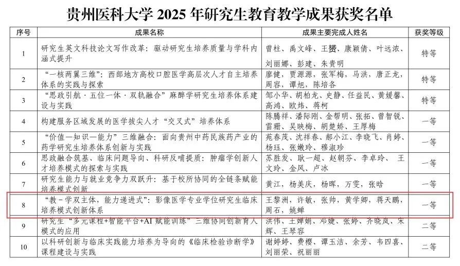 其中,公司王黎洲、许敏、张帅、黄学卿、蒋天鹏、周石、姚蝉老师完成的《“教—学双主体,能力递进式”:影像医学专业学位研究生临床培养模式创新体系》获得一等奖。团队立足临床教学实际,在研究生能力提升与就业竞争力培养方面作出了扎实探索,展现了学院在研究生公司产品改革中的创新活力与责任担当。